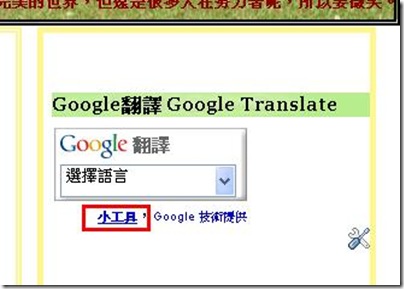 在網路也找到了不來恩的「Google翻譯按鈕,英翻中、繁簡轉換、日韓德俄法…按一下!全文翻到好!」但是內文並沒有將工具放置在個人網